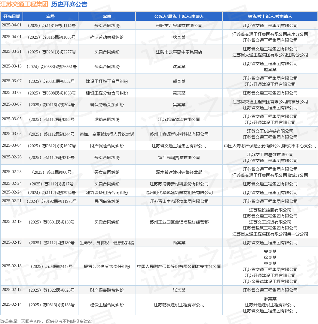 本站消息,根据天眼查APP显示,近日公布了一则江苏省交通工程集团有限公司作为被告/被上诉人的开庭公告,详细内容如下: